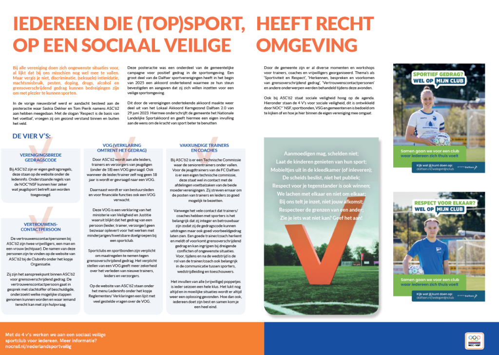 Iedereen die (top)sport heeft recht op een sociaal veilige omgeving Bij alle vereniging doen zich ongewenste situaties voor, al lijkt dat bij ons misschien nog wel mee te vallen. Maar vergis je niet, discriminatie, (seksuele) intimidatie, machtsmisbruik, pesten, doping, drugs, alcohol en grensoverschrijdend gedrag kunnen bedreigingen zijn om met plezier te kunnen sporten. In de...