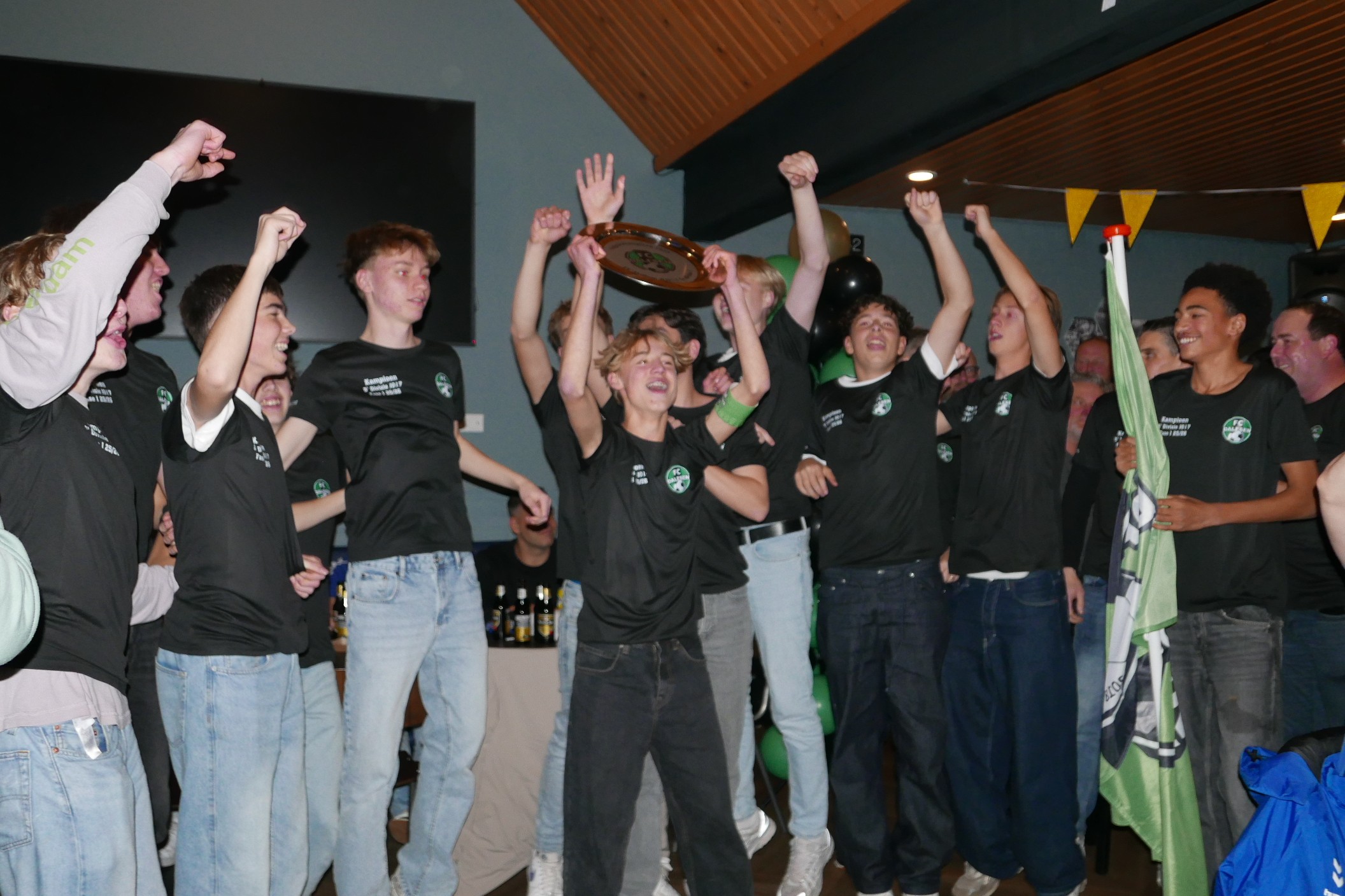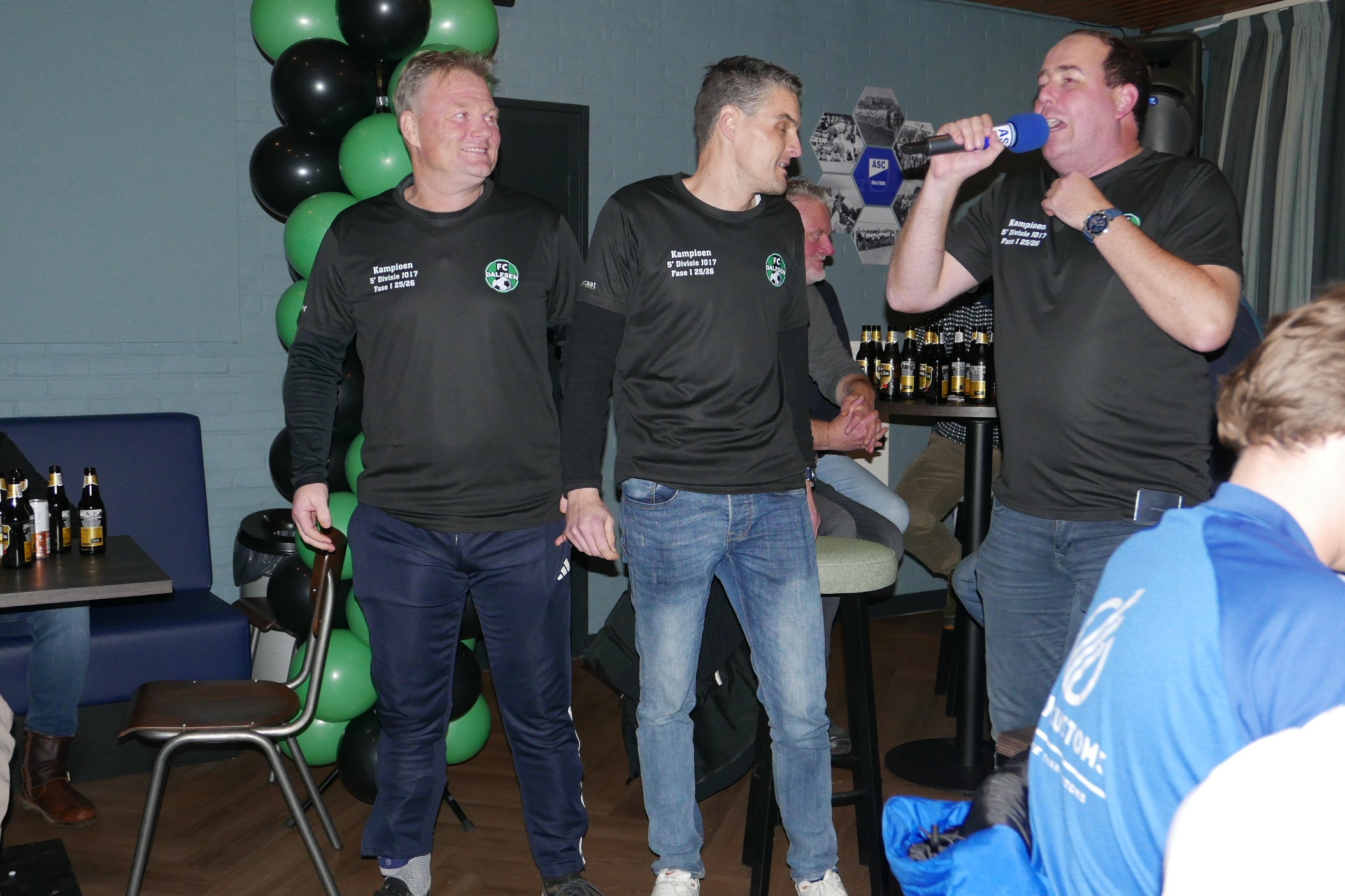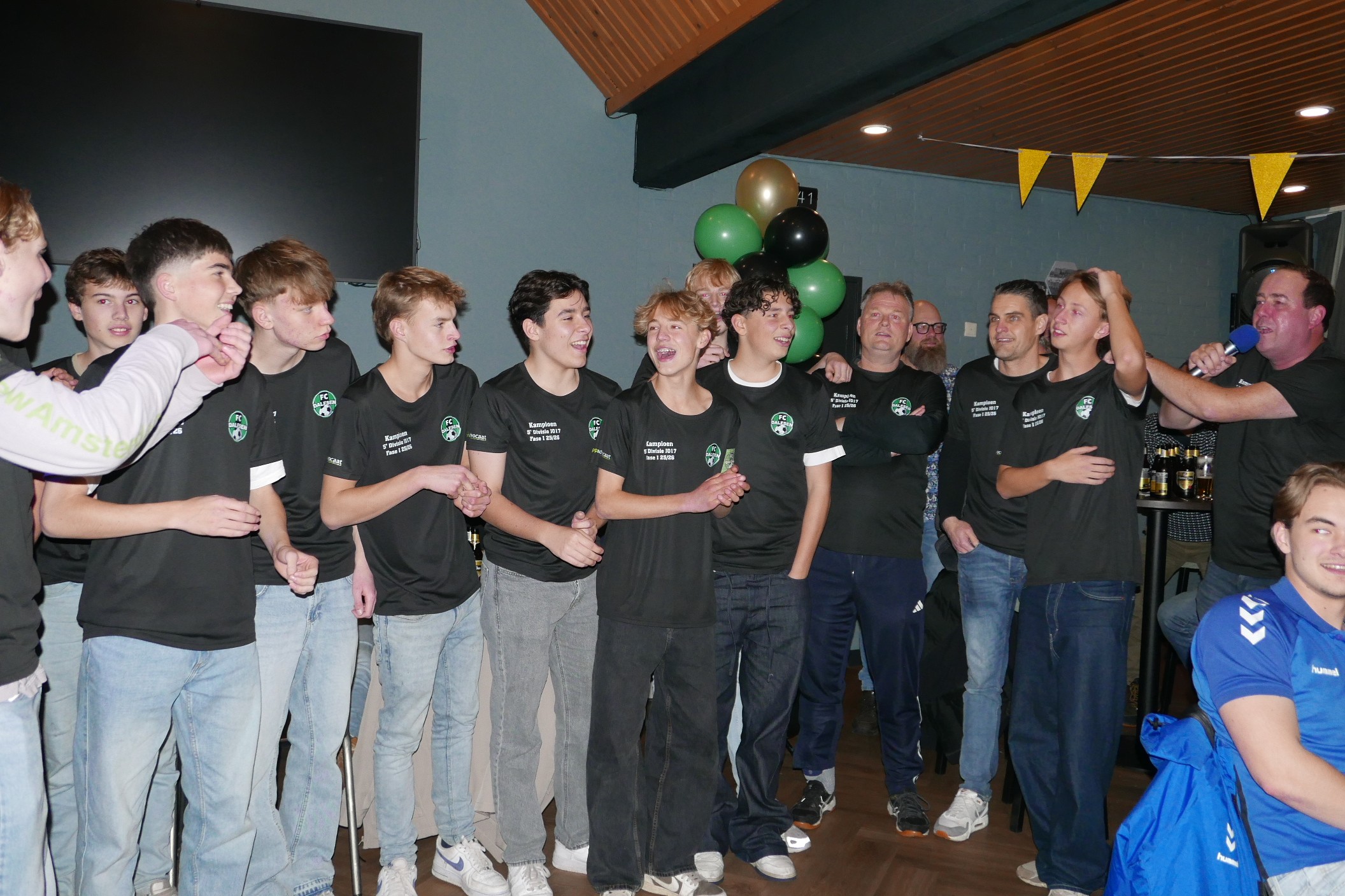De jongens, de trainers en leider Wim Ekkelenkamp werden enthousiast onthaald in het clubgebouw waar ze ‘De Kampioenschaal’ kregen uitgereikt. Om de feestvreugde te verhogen stond zanger Joy Woelders al klaar om met zijn aanstekelijke meezingers nog meer sfeer te brengen.