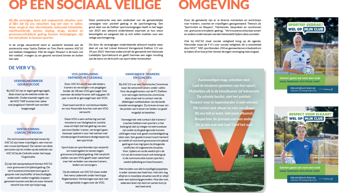 Ook bij ASC’62 staat sociale veiligheid hoog op de agenda. Hieronder staan de 4 V’s voor sociale veiligheid, dit is ontwikkeld door NOC*¨NSF, sportbonden, VSG en gemeenten en is bedoeld om te kijken of en hoe je hier binnen de eigen vereniging mee omgaat.