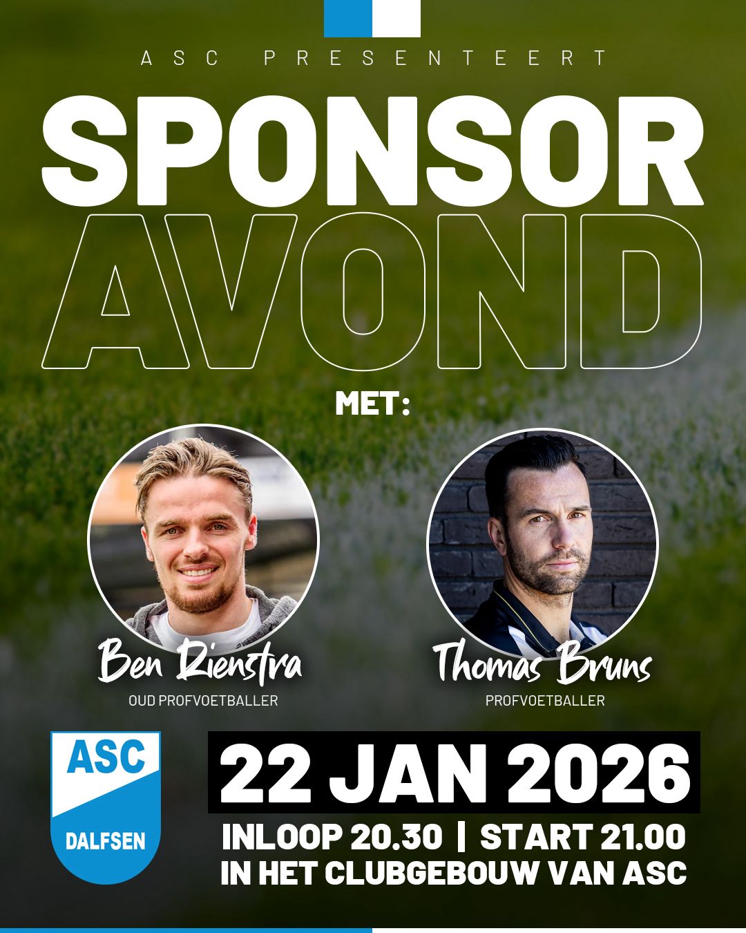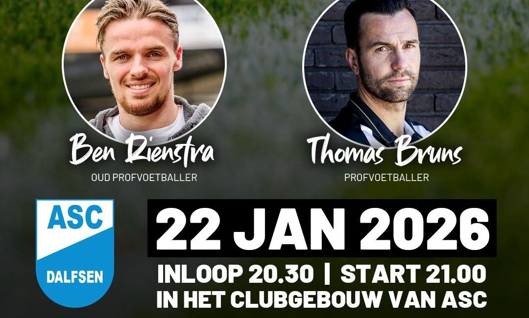 Op uitnodiging van ASC’62 maken Ben Rienstra en Thomas Bruns hun opwachting tijdens de sponsoravond op donderdag 22 januari. Vanaf 20:30 uur is de inloop waarna rond 21:00 uur voetballers Rienstra en Bruns aan het woord komen. Aanmelden voor deze avond kan bij Joop Bekedam (06 3070 8442).